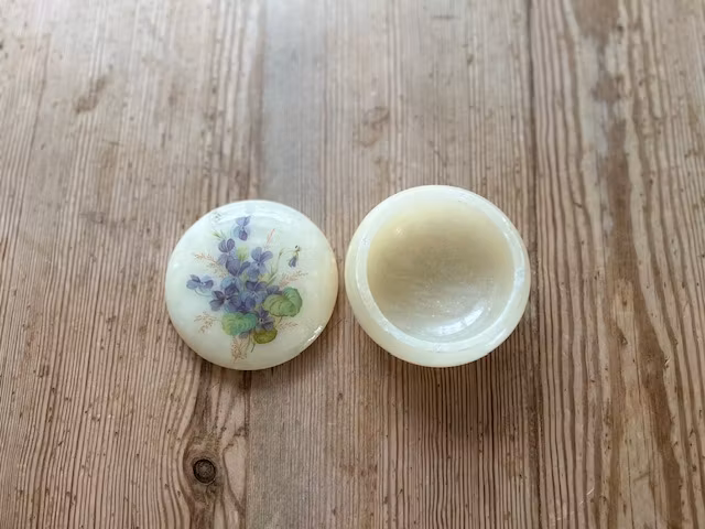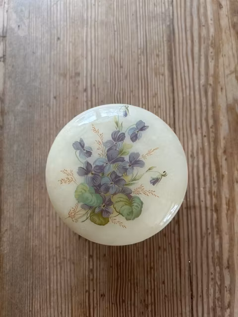 Dekorativ liten skål med lock, fint skick några nagg på kanten se sista bilden.