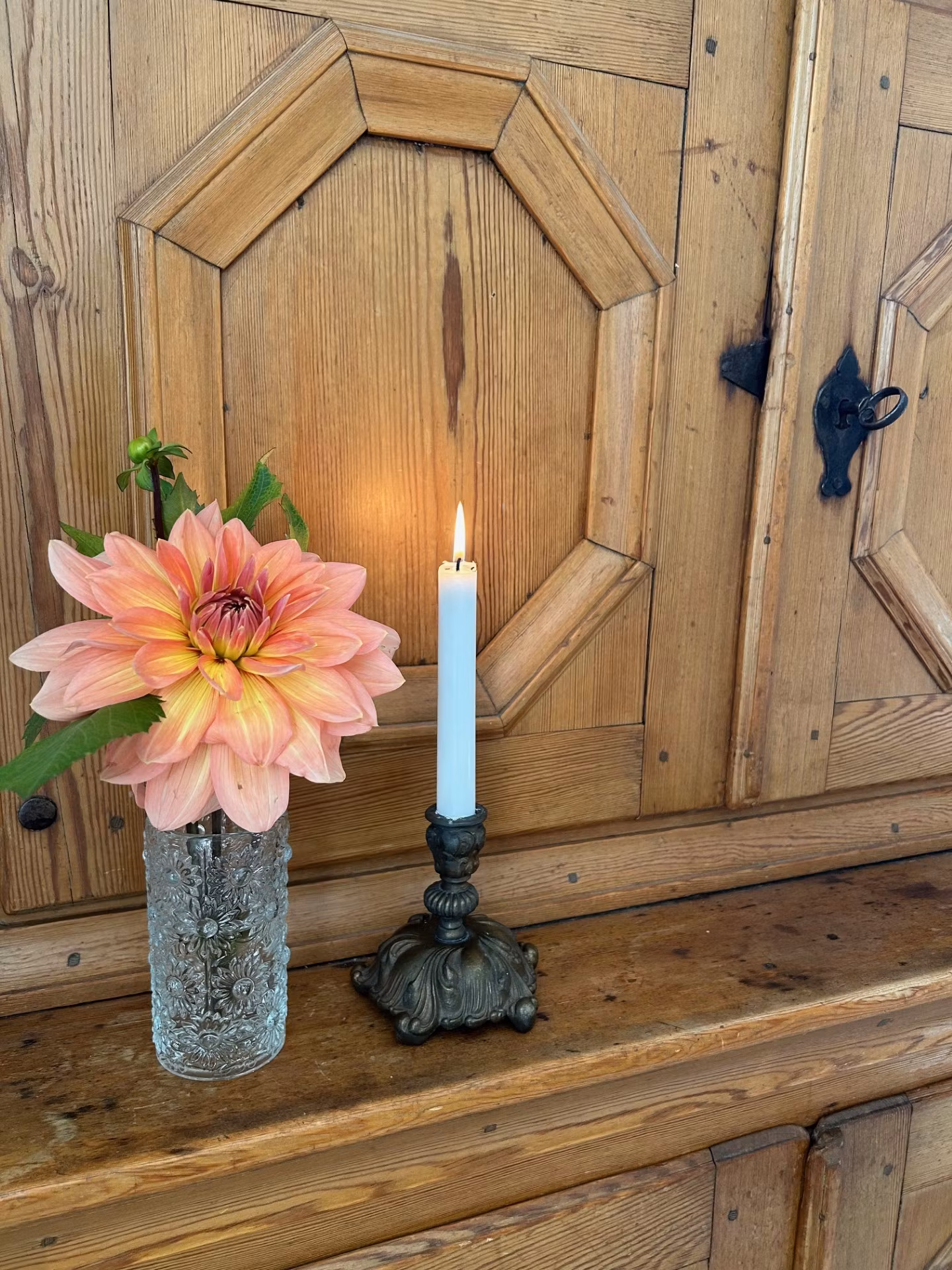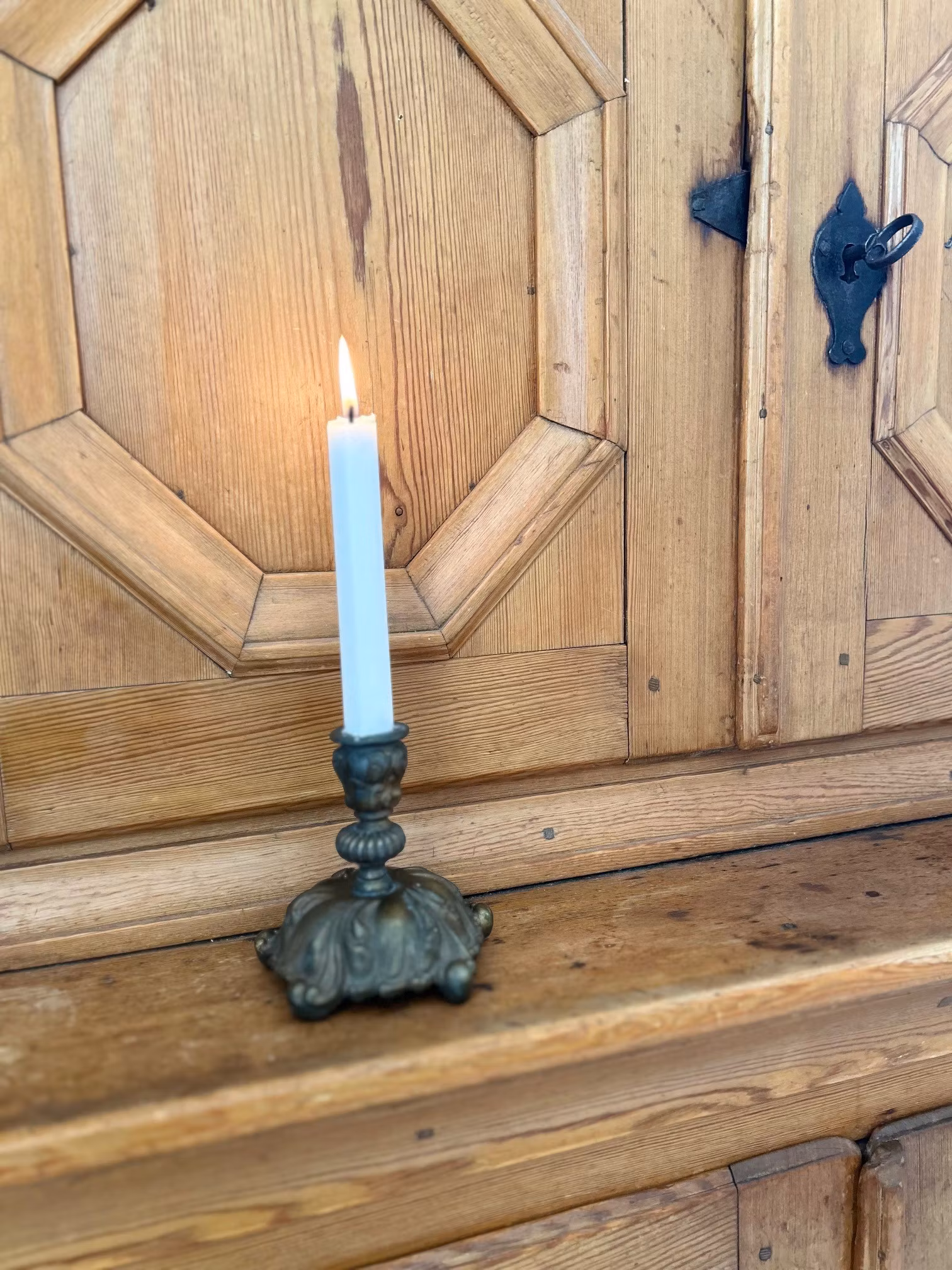 Ljusstake i järn, något ostadig i hållaren.