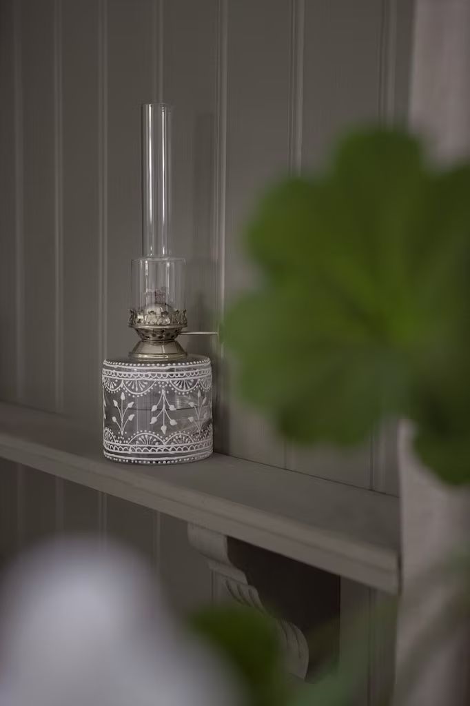 Vacker fotogenlampa i klarglas med vackra vita handmålade blommor, brännare i mässing och brännrör i klart glas.
