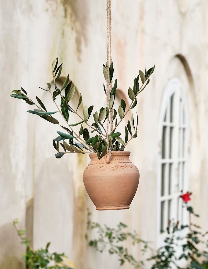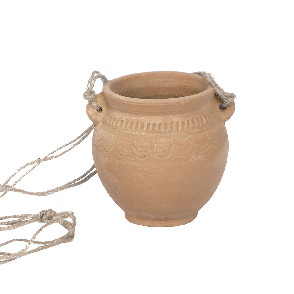 Handdrejad ampel i lergods. Lera är ett poröst material som är känsligt för väta, men passar för växter som behöver god tillgång till fukt. Produkten är giftfri.