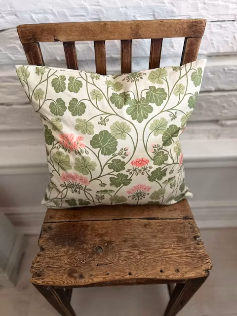 Kuddfodral pelargon, ljus bakgrund och rosa blommor. 100% bomull. dold dragkedja.